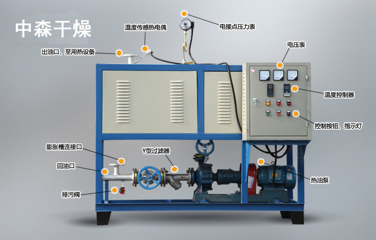 食品、化學(xué)工業(yè):聚合、縮合、蒸餾、熔融、脫水、強(qiáng)制保溫等;油脂工業(yè):脂肪酸蒸餾、油脂分解、濃縮、酯化、真空臭等反應(yīng)釜加熱、合成纖維工業(yè):聚合、熔融、紡絲、延伸、干燥等;紡織印染工作:熱定型輥筒加熱、烘房加熱、熱容染色等;非紡織工業(yè):無紡布等;飼料工業(yè):烘干等;塑料及橡膠工業(yè):熱壓、壓延、擠壓、硫化成型等。造紙工業(yè):干燥、波紋紙加工等。木材工業(yè):多合板、纖維板加壓成型、層壓板加熱、熱壓板加熱、油壓機(jī)控溫、木材干燥等。建材工業(yè):石膏板烘干、瀝青加熱、混凝土構(gòu)件保養(yǎng)等;機(jī)械工業(yè):噴漆、印花烘干等;