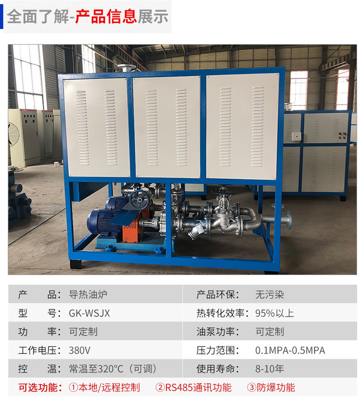 電加熱導(dǎo)熱油爐運(yùn)行可靠:具有完備的運(yùn)行控制和安全檢測(cè)裝置,可以精密地控制工作,防爆等級(jí)可達(dá)C級(jí),因而其更加安全。