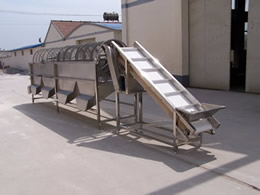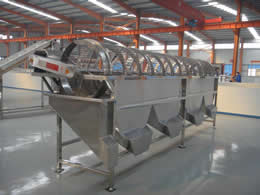 滾筒分級機又稱為鼠籠式分級機:除機架傳動部分,其余均為不銹鋼衛生級304制作,篩網先沖孔,后經機械卷圓處理,使之在使用過程中不傷害物料,篩網孔徑也可根據用戶要求設計制作,產品通過提升機輸送到分級機里面,由于傳動作用,滾筒在不停地運轉,物料從小到大分級出來。可將原料分為3-10等級。大棗分級機使用范圍:本機適用于大棗、冬棗、小西紅柿、蒜米、山楂、桃子、胡蘿卜、桔子、香菇、土豆、洋蔥等分級使用,具有分級標準、效率高等優點,配套調速電機及防撞墊,可根據品種調節速度減小撞擊力,保障產品無破損。