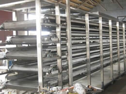 因此采用多段組合能更好地發揮網帶式熱風烘干機的性能,且干燥更均勻,并能使產量成倍提高,為用戶大批量的生產、取得經濟效益提供了可靠的保障。