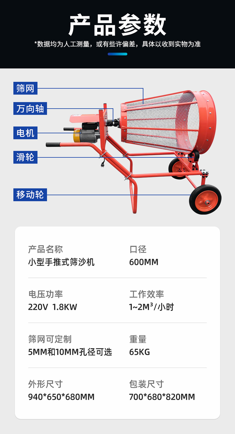 2、篩分速度快:該機每小時可篩5-15噸,人工每小時篩沙10噸,它是人工的10多倍。使用方便省力:該機進料高度低、體積小、重量輕、移動靈活、操作方便,適用于多種施工現場。應用范圍:適用于大小建筑工地,煤場、糧食、炮廠、鑄造、種花苗圃、藥材、建筑砂漿等.