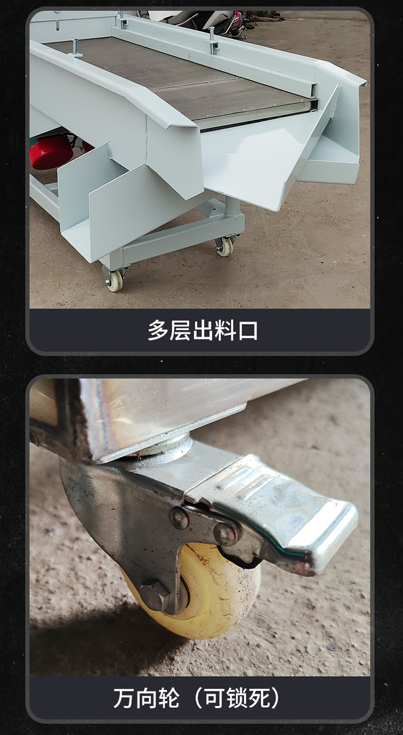 2、振動篩選機可選用220V-2.2kw或380V-1.5kw電機做動力源,集風選和篩分為一體,能干凈徹底地清除糧食或油料種子里面的各種雜質和塵土,振動分選機由料斗、機架、傳動機構、風機、風道等五部分組成,機架地腳裝有四個輪子,方便移動;篩網與機架采用分體式結構,便于更換各種不同目數的網篩。