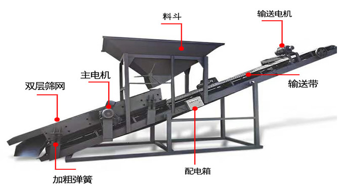 整個篩沙機設備由原料儲料斗、原料供料皮帶機、平置篩網、成品砂堆料皮帶、棄石出料槽等組成,設備通電運轉后由裝載機將原料裝入大容量儲料斗,原料經由供料皮帶投入到平置篩筒,旋轉的篩筒帶動原料在筒內葉片的推擠、翻滾下形成原料在篩網面滑滾的人工篩砂效果,篩出的成品砂通過集料斗落在成品砂皮帶上,同時被皮帶提升落下呈成品料堆、或直接落入儲料斗,整個過程連續且物料分級清楚、準確。